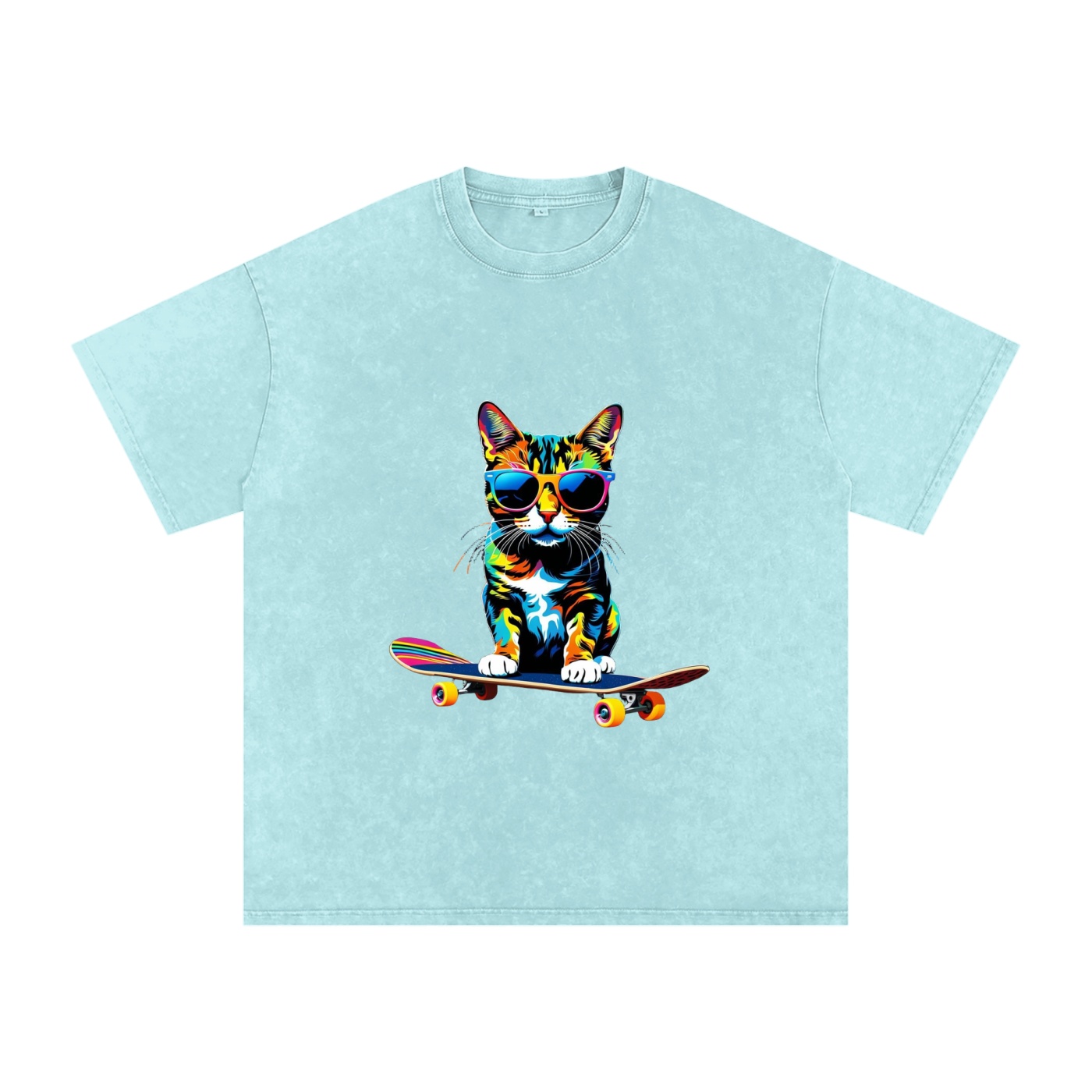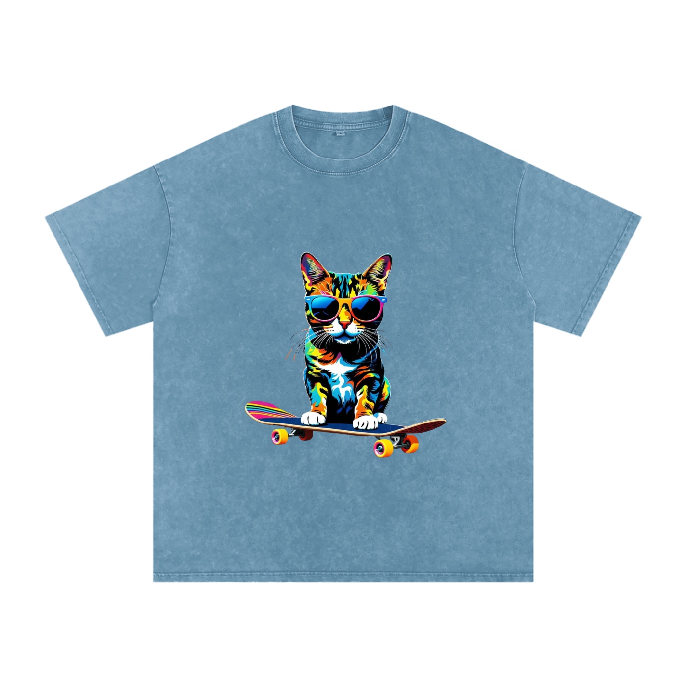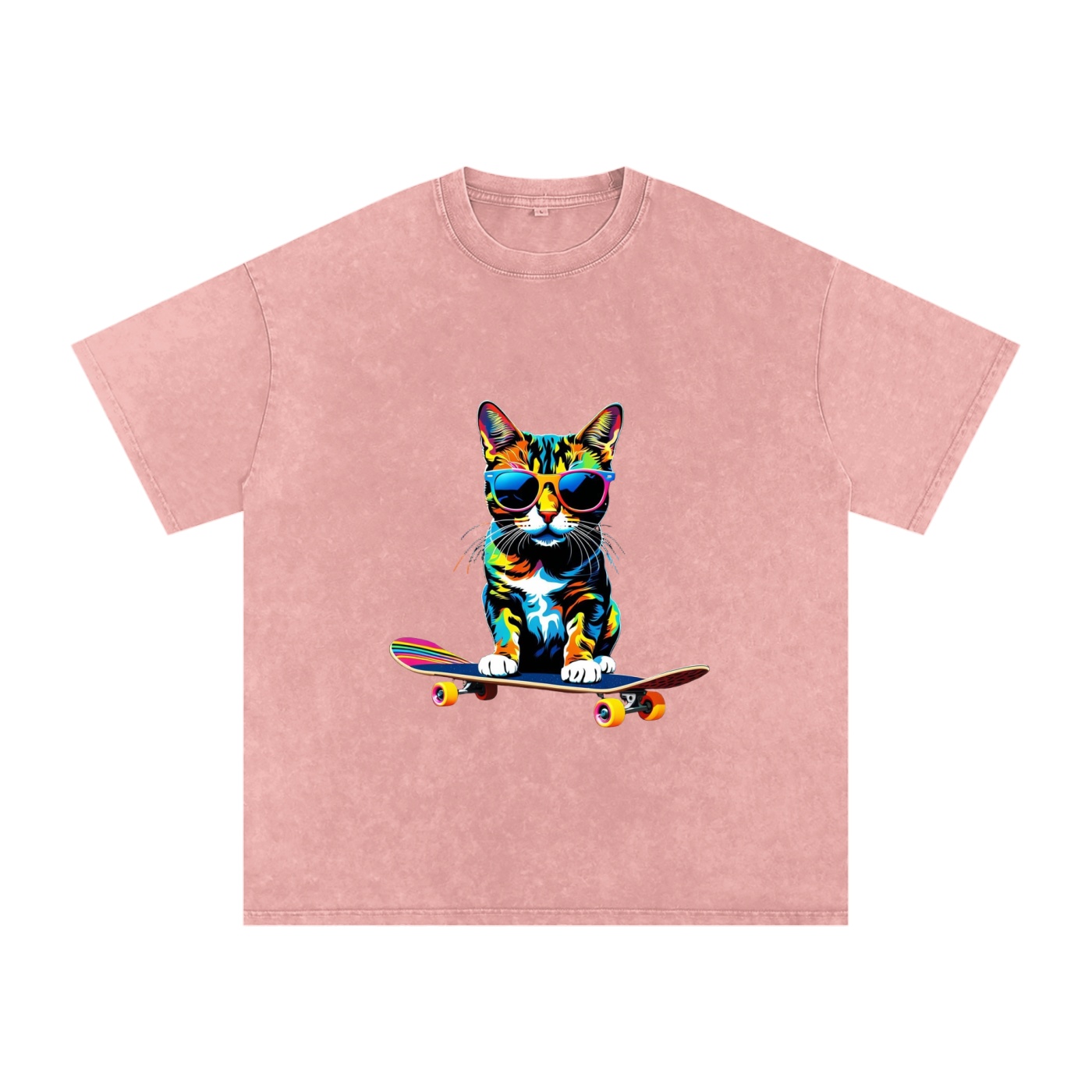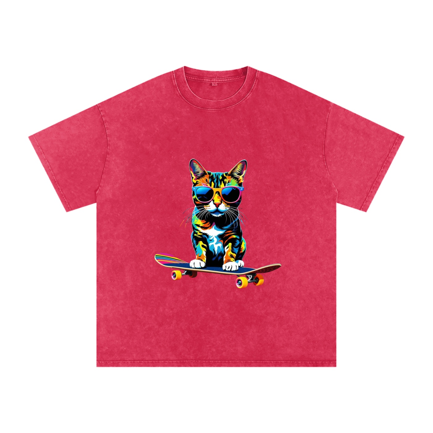 Q: How do I care for my pop art cat on a skateboard t-shirt? A: Machine wash your pop art cat on a skateboard t-shirt at 30°C on a gentle cycle, tumble dry low, and avoid ironing directly on the print to keep the colors vibrant.