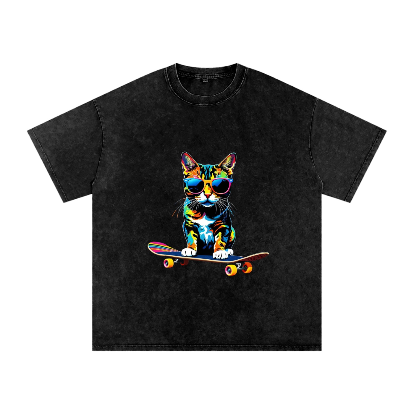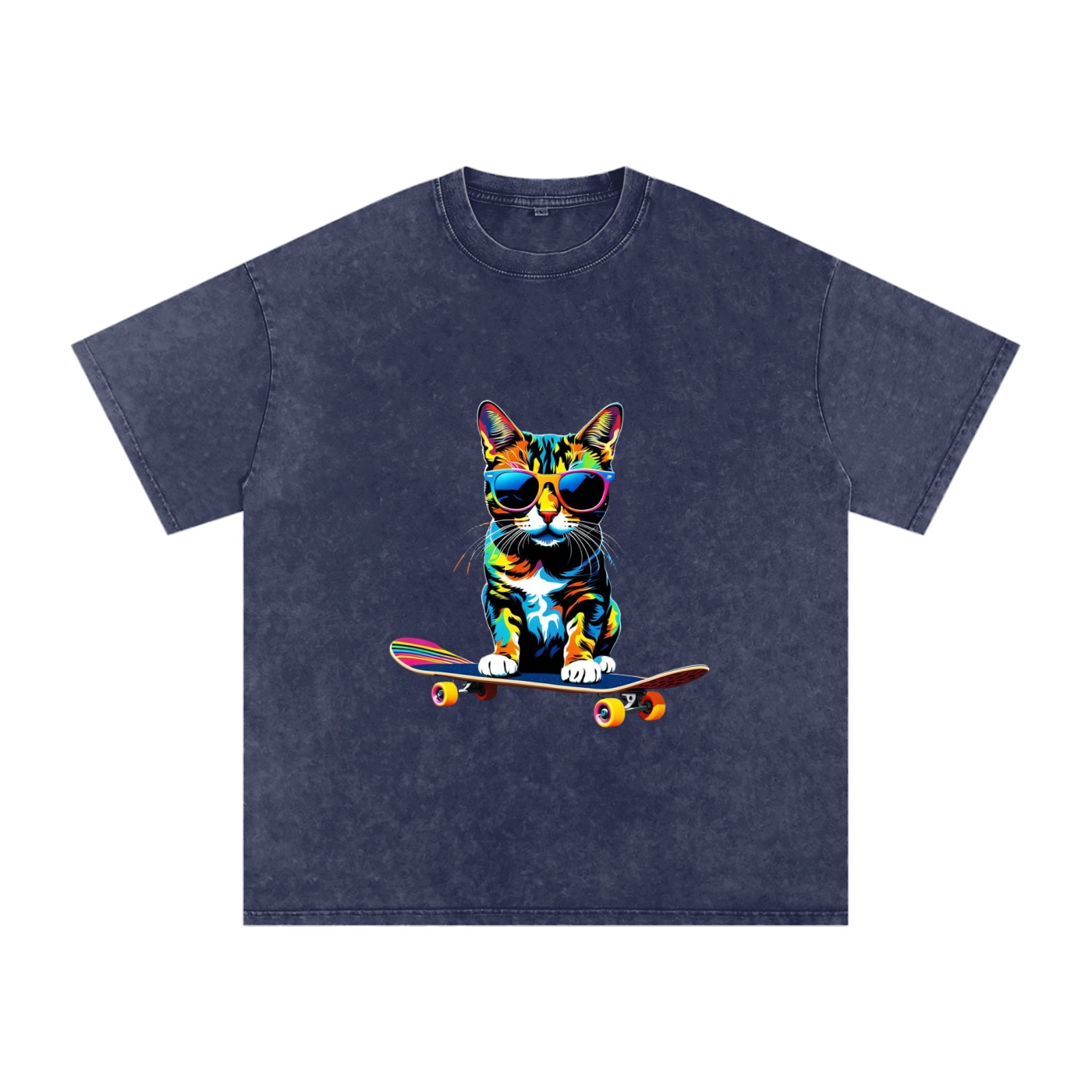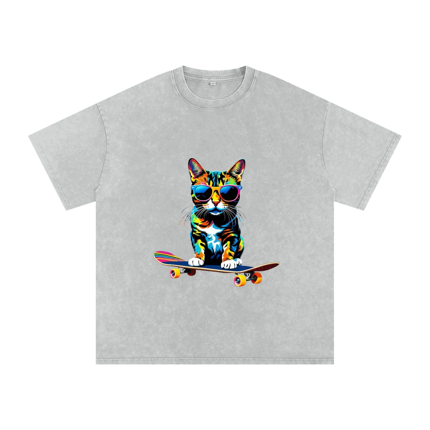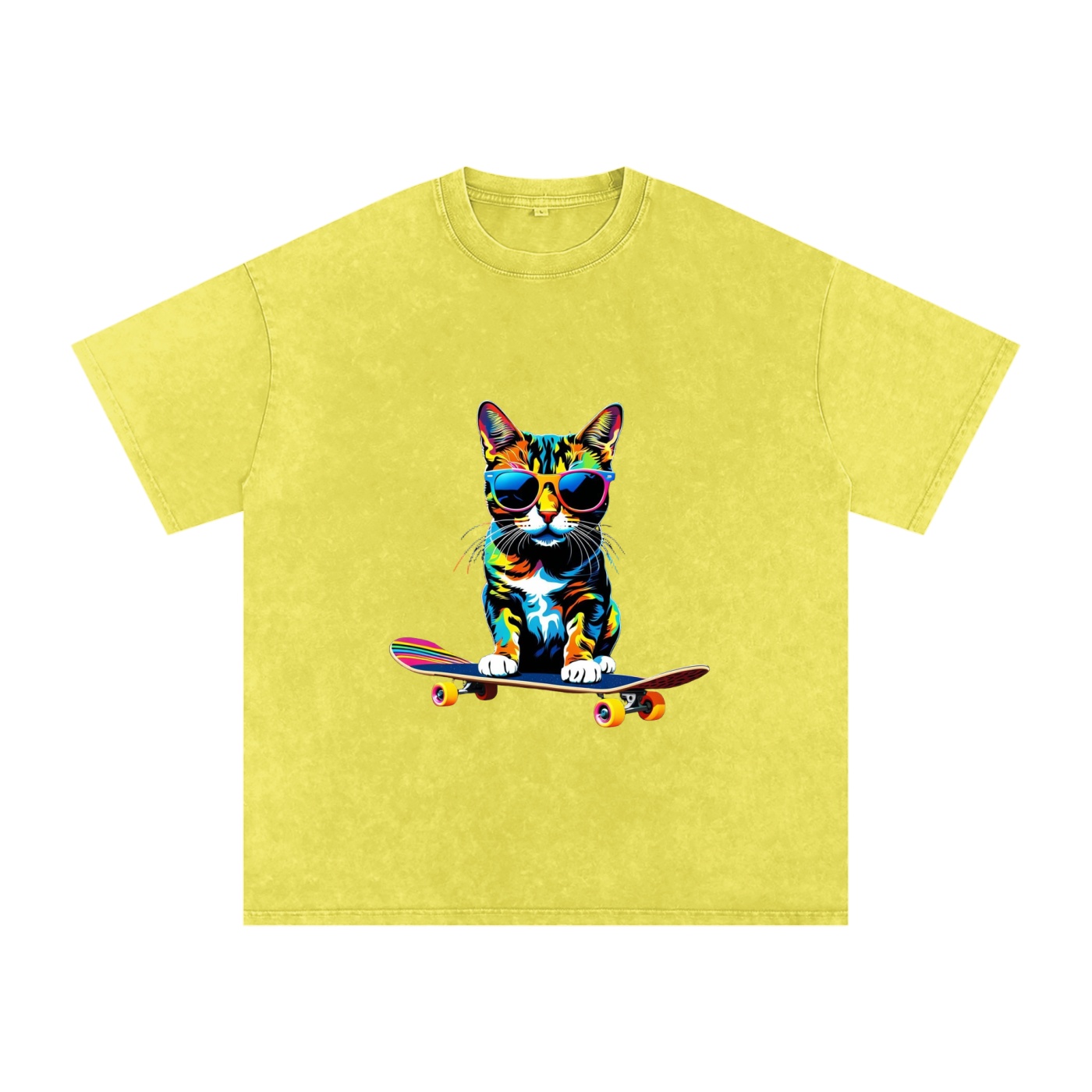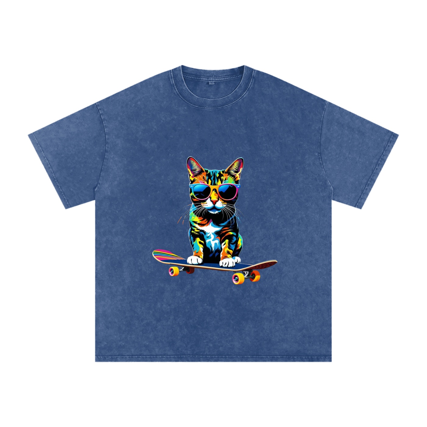 Q: How do I care for my pop art cat on a skateboard t-shirt? A: Machine wash your pop art cat on a skateboard t-shirt at 30°C on a gentle cycle, tumble dry low, and avoid ironing directly on the print to keep the colors vibrant.