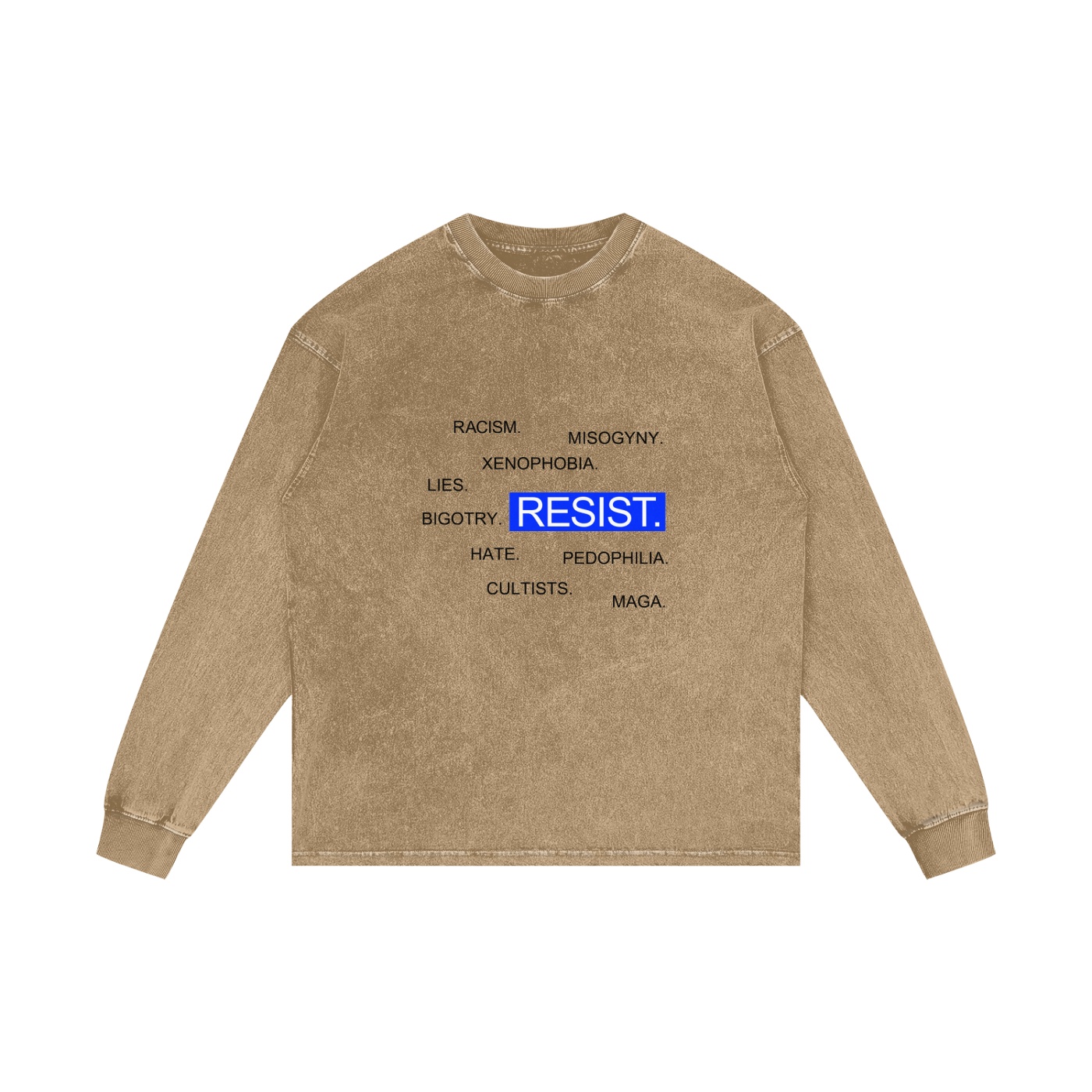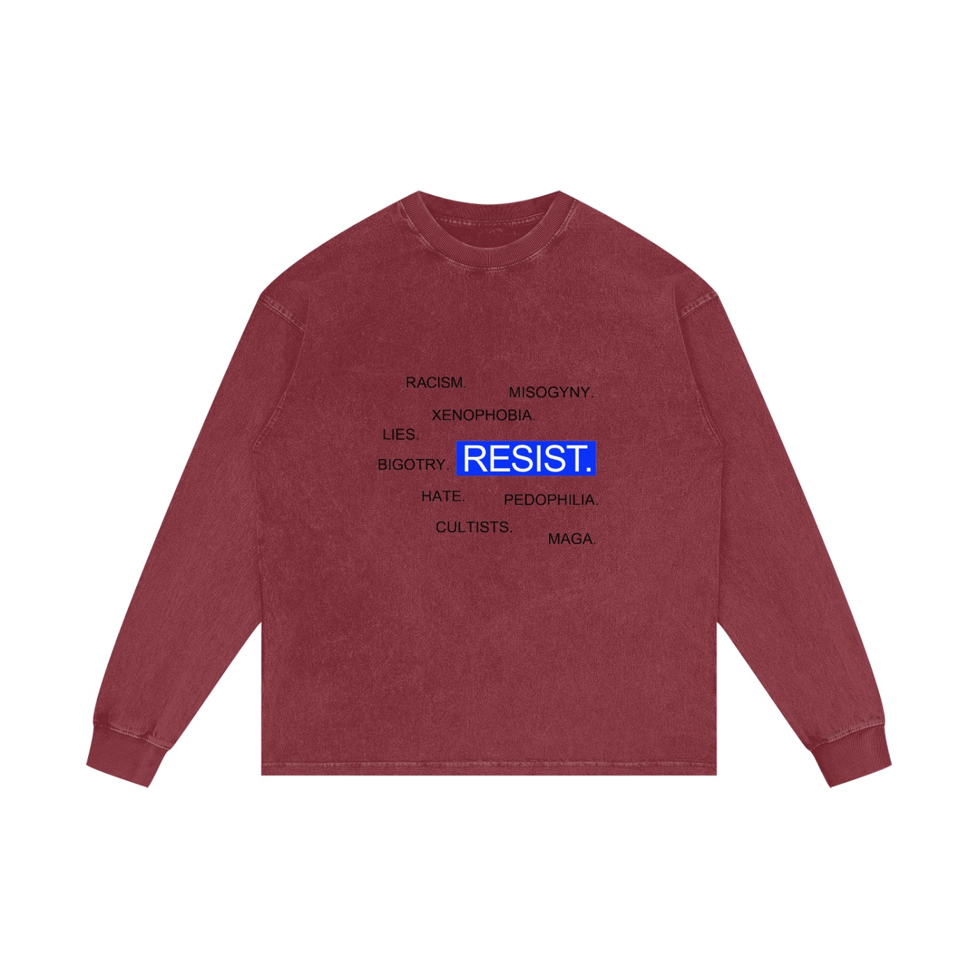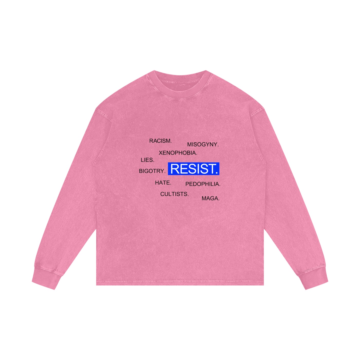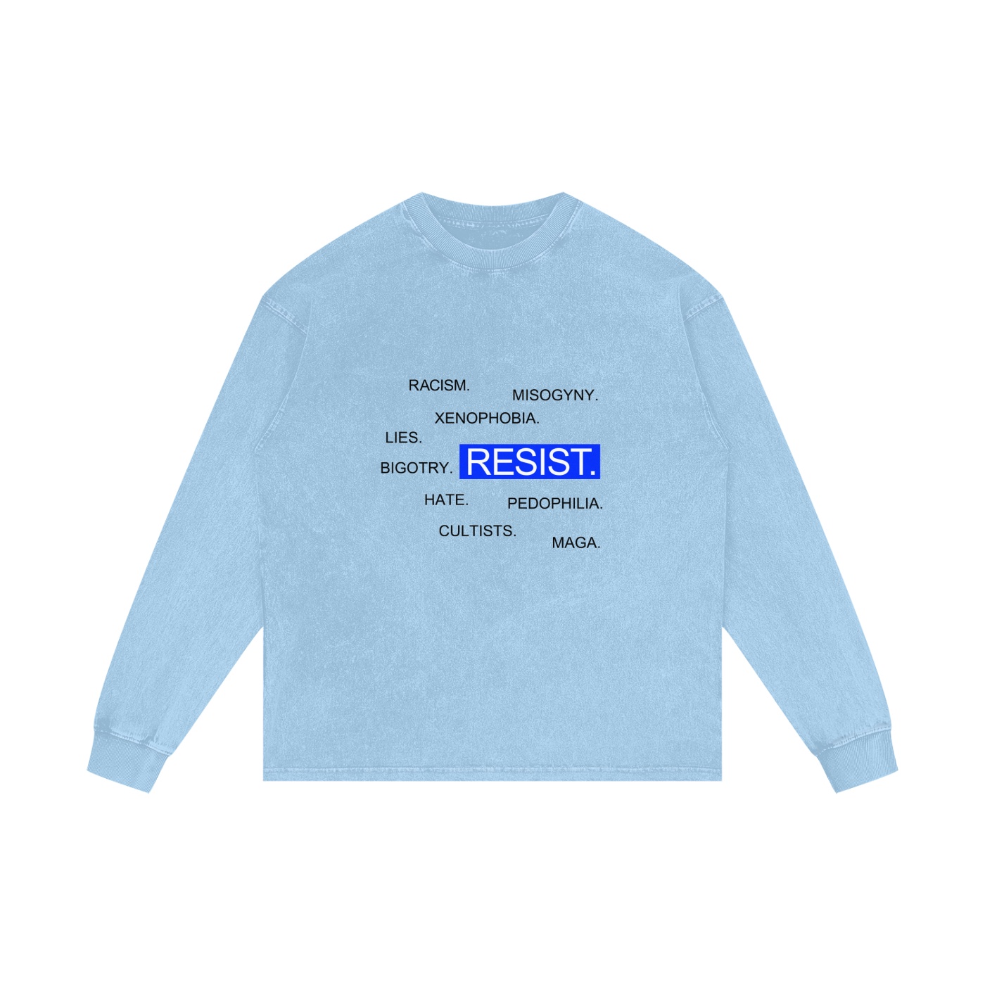 The Resist Light Long Sleeve Shirt features bold blue “RESIST” with our comprehensive list of societal failures: racism, misogyny, xenophobia, bigotry, lies, hate, cultists, pedophilia, and MAGA. The light background creates a more approachable vibe while the black text delivers maximum contrast and readability. Think of it as resistance with better lighting for your Instagram activism—because if standing up to fascism isn’t documented, did it even happen?